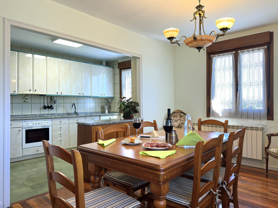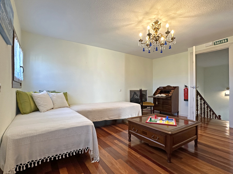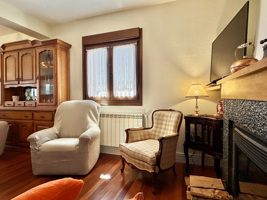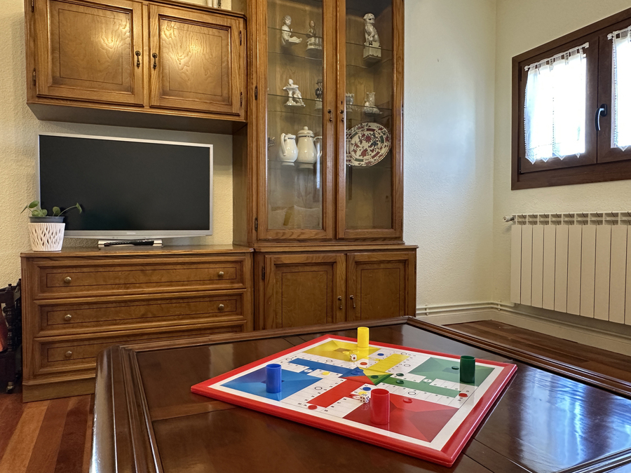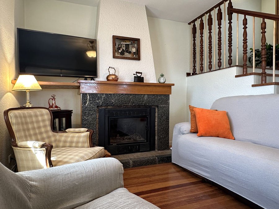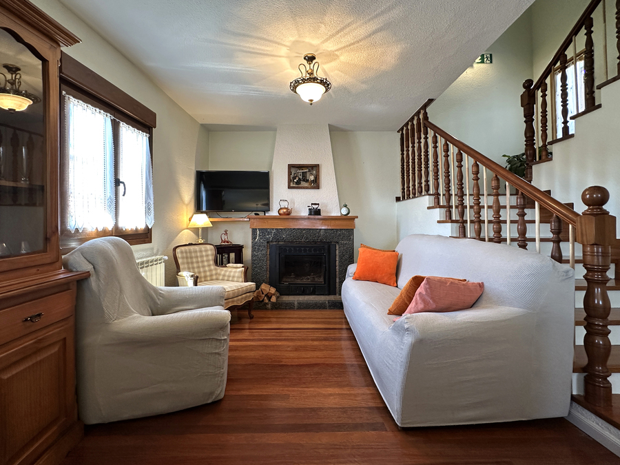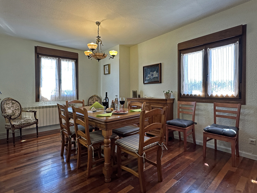 En el salón hay espacio suficiente para que pueda comer todo el grupo. También tiene amplios sofás para disfrutar ante el fuego de la chimenea en los días de más frío. Tenemos una pequeña biblioteca para disfrutar de la lectura, escuchar música, ver la tv u otros elementos de ocio.